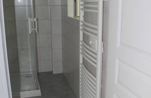 The bathroom is composed of a shower, washbasin and a towel dryer.