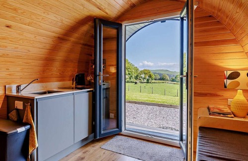 Discover beautiful uninterrupted countryside views from the comfort of a private wood-fired hot tub at this wonderful wooden glamping pod on the corner of a quiet working farm in Denbighshire. The open plan design provides a bright, spacious living area while the exposed woodwork and curved ceiling add a cosier touch. The functional kitchenette and shared use of a restored 1930's railway carriage with laundry facilities provide everything you'll need for a relaxing rural escape to the North Wales countryside.