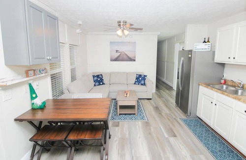 When you enter the property, you will be impressed by the upgrades. Cool toned wood inspired flooring span the entire property, giving it a modern and chic vibe. The open-concept layout fosters an intimate and cozy atmosphere, perfect for relaxing. The kitchen spans the back wall. Equipped with full-sized stainless-steel appliances The kitchen, located at the back wall, boasts full-sized, stainless-steel appliances and kitchen gadgets such as a Keurig. The white cabinets add to the space's brightness and lend it a clean, airy feel. Adjacent to the kitchen is a bench-style dining table that seats four and is positioned alongside a large sectional. The comfortable and snug, gray-toned sectional offers ample space for your group to gather and watch TV.