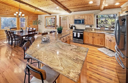 ★★Golden Oaks is your next Big Bear getaway in this luxury log cabin nestled on a peaceful street in the prestigious Castle Glen neighborhood of Big Bear Lake. Centrally located and conveniently less than a mile to the Big Bear Convention Center, Big Bear Snow Play & Go Karts, Grocery Stores & Restaurants, this retreat is ideal for a group of small friends or a family looking to experience all the adventures the mountain offers. Enjoy a gourmet kitchen and wonderful amenities like a wood burning fireplace, smart flatscreen tvs and laundry room to make your stay as enjoyable as possible!★★
