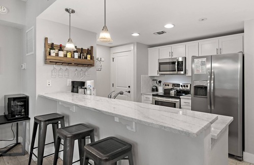 As soon as you walk inside, you’ll immediately be relaxed and ready for the beach! Enjoy the wood plank flooring, and the white, blue and gray color scheme that brings the beauty of the beach inside. A fully equipped kitchen with stainless steel appliances is ready for you and your guests to whip up a meal or enjoy a quick snack. Gather around the dining table or take a seat at the breakfast bar while you enjoy your favorite foods and plan your vacation adventures with your guests. After a full day, head to the living room and plop down in front of the 60” flat screen TV – perfect for family movie night or catching up on your favorite shows. The TV has an upgraded cable sports package, also, so you and your guests can watch the big game! While you’re watching a movie or cheering on your favorite team, throw a bottle of wine or your favorite drink to chill in the wine fridge.