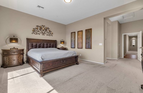 The master bedroom has a king sized bed (Tuft and Needle adaptive memory foam mattress with a Sleep on Latex topper), a 75" TV, a large picture window that overlooks the golf course, and a door that provides a private exit to the backyard. The master bathroom has separate sinks, a garden soaking tub in the center, separate shower, and large walk in closet. The guest bedroom has a king sized bed and an attached bathroom with two sinks and a newly renovated shower. This bathroom is shared with the office. The 3rd bathroom is located off the main living area. With only one neighbor beside the home, it gives you additional privacy.