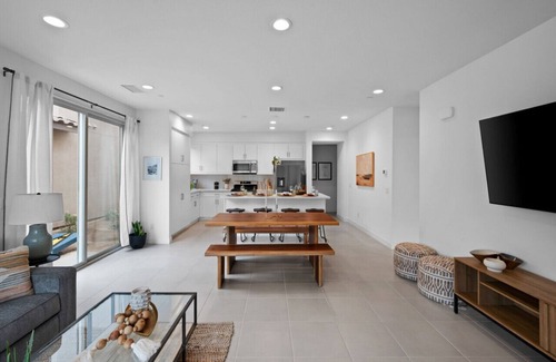 The living room opens up to your own private outdoor desert paradise with something for the entire group. The beautifully landscaped yard features an outdoor dining table, couch seating area, a fire pit, and gas BBQ.
