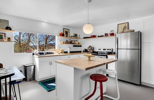 Discover a new meaning of peace and quiet as your body adjusts to the rhythm of the sunsets and moon rises across the expansive desert valley. The home sits in the shadow of the Sheep Hole mountains rising up in the back yard. Enjoy 180 degree views from the front and back porches, write the next great American novel in the detached studio across the street and cook a delicious feast in the fully stocked kitchen.