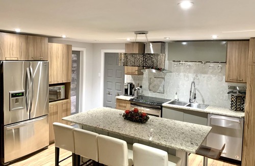 Zen2 Apartment on lower floor: Bedroom with 2 Queen beds that can accommodate up to 4 people comfortably. Living area with large screen LED TV with internet services (Netflix, Bell Fibe TV, and Youtube). Full bathroom with double sinks, bathtub and shower, equipped with washer and dryer.