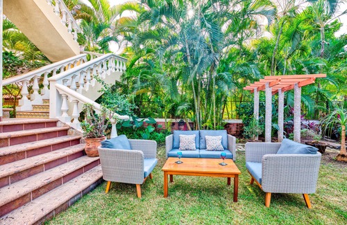 Enjoy your private oasis with cool breezes while sitting on the expansive pool side terrace. The property is completely walled off for privacy, with heated lap pool, and air-conditioned throughout. 3 Bedrooms, 2 full bathrooms. Enjoy fine amenities such as large entertaining kitchen with granite counter tops and eating bar, marble bathroom counters, and large tiled walk in showers. Custom stained glass windows accent the high ceilings and large arched wood clad windows. Awesome stone paths lead you around the gardens, 2 pergolas, and up to the rooftop patio with mountain views in the distance and mango groves next door. This is a private gated community with 24/7 security on duty, and only 1 mile (15 minute walk) from beautiful Bucerias beach. Be our guest and enjoy our "Casa de Paz" (House of Peace).
