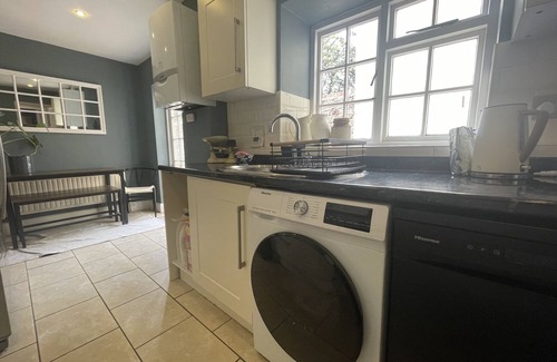 The bright and airy living room is furnished with a comfy L-shaped sofa, perfect for unwinding in front of the TV. A dedicated desk area is also available, ideal for working remotely or planning your stay. The separate dining room provides a welcoming space for family meals or entertaining guests.