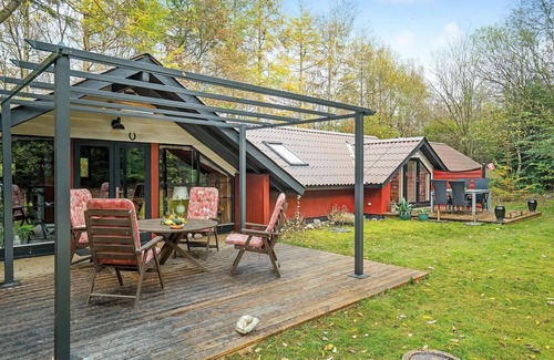 Look forward to a relaxing time in this vacation home in the middle of nature not far from the fjord. The spacious house is brightly furnished, has sloping ceilings and in most rooms the walls are beautifully clad in wood. In one of the two living rooms you can eat together at the large dining table with a view of the beautiful trees outside, in the evening you can play games with friends or family in one of the cozy sofa corners or relax reading a good book. From each living room you can access a terrace (one is partially covered) with garden furniture and barbecue, where you can have a nice breakfast in sunny weather and end the day in the evening.