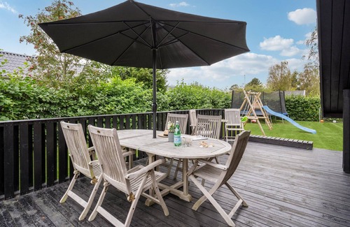 The outdoor area boasts a spacious, sheltered terrace that is ideal for al fresco dining. Relax on the garden furniture and enjoy the fresh air under the parasol. The large garden offers plenty of space for children to play and has a swing, a slide and a trampoline. There is also a charming playhouse for younger guests.