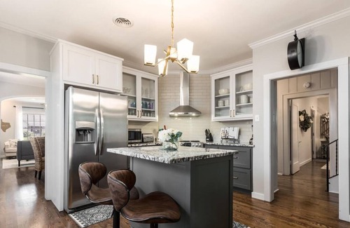 Welcome to Sweet Memories Movie House! Our almost 100 year old "fix up" look alike! Beautifully remodeled and furnished, our over 2100 square foot cottage offers your own PRIVATE HOME MOVIE THEATER with 8 leather recliners, surround sound and a 100 inch movie screen, game room featuring air hockey, corn in the hole and a professional free-play ARCADE GAME CONSOLE, with over 60 games like Pacman, Frogger and Centipede to name just a few! Our backyard has a covered patio and outdoor area with fountain, all decorated with lights. Our fully-stocked and remodeled kitchen boasts brand new stainless appliances, granite counters and a coffee "bar" featuring coffee maker, keurig machine, with 12 free K-cups, a coffee grinder, french press, and electric tea kettle. We have many appliances and utensils such as a blender, griddle, waffle maker, crock pot, immersion blender, wine opener, wine and margarita glasses, pitchers and all the other "essentials" you might need. We leave you plenty of dishwasher tabs, dish washing liquid, scrub sponges, trash bags, paper towels and toilet paper too. We also offer a tankless water heater so no running out of hot water here!!