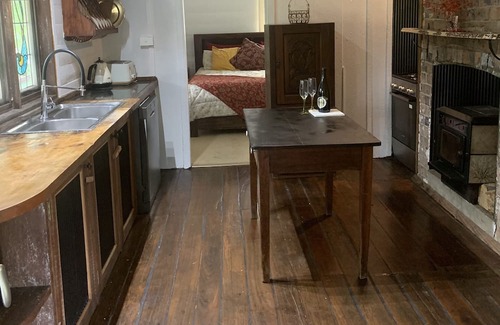 The cottage has been tastefully renovated and styled with lovely furnishings while keeping with historic fell of the home. There are two luxurious bedrooms, one with a king size and the other with a double bed (both have single trundle beds underneath for additional guest), and the second room has the original fireplace, which now has an electric log fire to enjoy without the mess and hassle of an open wood fire. In the open planed dining and living area, there is plenty of seating and a double sofa bed that converts for extra guest sleeping, 8 sitter formal dining table, air conditioner, ceiling fan, games cupboard, TV, free Wi-Fi and even a jigsaw puzzle table, it is a sunny and inviting space. The timber kitchen has all the mod cons of a dishwasher, coffee machine, air fryer, new gas stove plus a fireplace with a slow combustion fire.