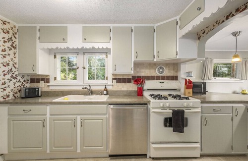 It should be noted that our cottage was built in the 1940s, as such, it has plenty of charm and “cottagey” (as we affectionately refer to them as) features, like a slightly sloped kitchen floor and well-loved countertops. We plan to update the countertops in the future but, for now, feel free to use our fully stocked kitchen, sloped floor and all, complete with some spices. We also have kids` dishes, a high chair, and a pack-n-play available for our littlest guests.