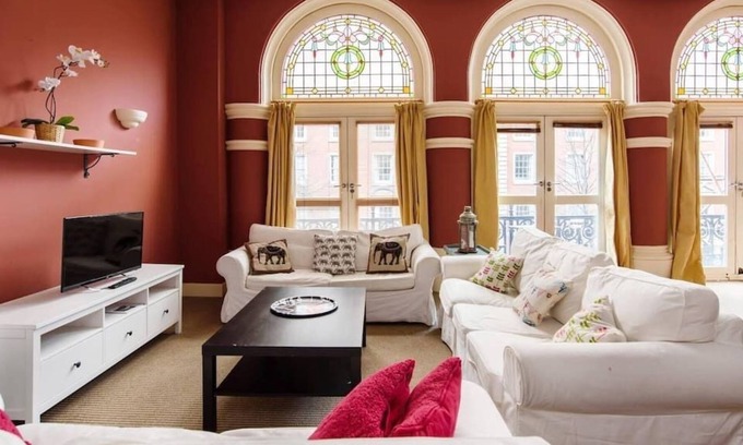 Situated in an historic Cardiff building called The Grand, this is a uniquely stylish one double bedroom flat with a spacious open plan living room including a good sized sofa bed, enabling this property to sleep up to four people. The apartment has beautiful period features including Art Deco arched windows and antique furnishings. Comfortably kitted out, it benefits from the usual mod cons including a large bathroom (with separate shower and bath), well-equipped kitchen, Wifi and television.