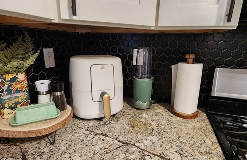 The updated kitchen has granite countertops and all the amenities; gas range, dishwasher, coffee bar, ice machine, toaster, air fryer, stainless cookware, smoothie blender, kettle, wine glasses, storage containers, snack, serving and baking dishes. Table setting for eight.