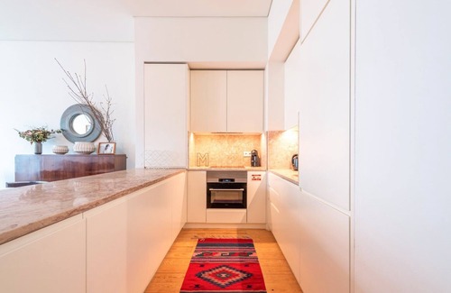 The bright, whitened, typical Lisbon light comes in from the charming windows in the living area, where a convertible couch, two armchairs and a TV will allow you the best relaxing time after a day out. Right next to it, there's the dinner area, equipped with a table and seats for 4.