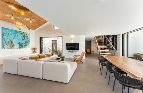 The decor of Villa GwaKana, both chic, sleek, and modern, creates an atmosphere of discreet luxury, making this place exceptionally exclusive. The living room, spacious and bathed in light, with its high vault, is a perfect living space, including a cozy TV lounge with a large corner sofa, ideal for spending time with family or friends. The indoor dining room, a natural extension of the open and fully equipped kitchen, has a solid wood table that can accommodate 10 guests.