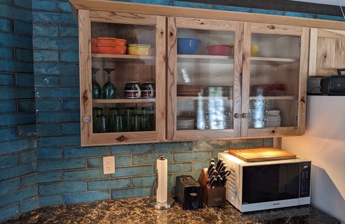 KITCHEN: 100% ready to prepare full meals. Includes cook top, oven, indoor grill, microwave, 4 cup coffee maker, 10 cup coffee maker, plates / dishes / glasses / utensils, pots & pans.