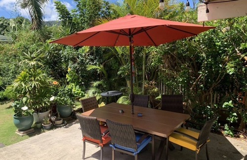 Old-style Hawaiian house a three minute walk from one of the best beaches in America. Ductless a/c in living room and two bedrooms (third br has window a/c). Beautiful garden setting with private lanai. Kitchen is well equipped for cooks. Private lanai and semi-private patio.
