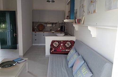The 45sqm flat with a balcony is fully equipped and furnished for a comfortable summer living. Guests can enjoy sandy beaches in 150mts from the flat with either free beach seating or organized beach seating in nearby beach bars (TO KYMA and ASTERIAS).