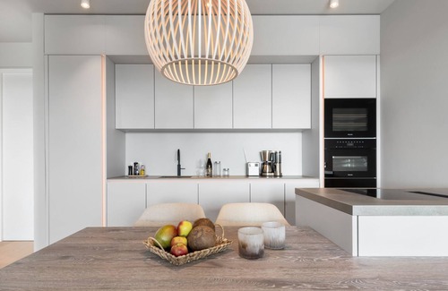 The open kitchen, seamlessly merging with the living area, will excite any cooking enthusiast. It is fully equipped with modern appliances, including an induction cooktop, a wine refrigerator, a Quooker, and an oven with a warming drawer.