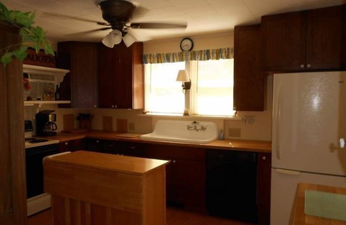 The KITCHEN was remodeled in 2015 keeping its farmhouse style with dark oak cabinets, butcher block counter tops and a breakfast island. The large porcelain sink and vintage green stove pay tribute to the past while enjoying the modern conveniences of a dishwasher, garbage disposal, microwave, electric stove and refrigerator with ice maker. The wall air conditioner and ceiling fan keep the kitchen cool while cooking. The mobile island provides additional work space and storage for recycling. The kitchen is fully stocked with dishware, glasses, pots, pans and even a crock pot.