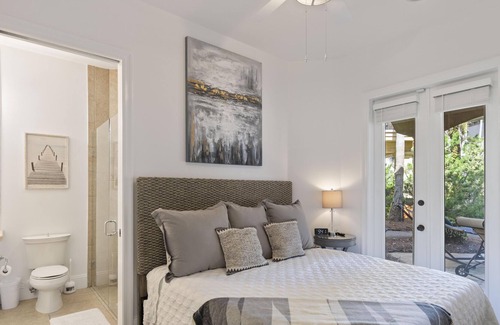 Take in Florida’s Emerald Coast in Luxury within the heart of Miramar Beach Florida. This Majestic Villa consisting of four bedrooms and four baths is in the highly sought-after tropical oasis of Saint Tropez. This lush, private gated community along the breathtaking 6 mile stretch of old scenic highway 98 consist of only 31 Mediterranean Villas, all connected by cobblestone streets and pathways. The six mile stretch of Old Scenic Highway 98 spans from Miramar Beach Fl on the East end to Destin Fl on the West end. All accessible via golf cart or vehicle. This Villa is new to the rental market having previously been a primary residence it has recently been remodeled to have the best of both worlds. Mediterranean on the exterior and a coastal whitewashed vibe on the interior. 90% of the interior has elaborate marble and porcelain flooring that will take your breath away. Having been the model house, no expense was spared on the finish outs. Haven’s Getaway has a great footprint that affords the Villa the only large cobblestone circle driveway in the community. Driveway is located just inside the security gate and easily accommodates parking for 6-8 vehicles. Hence, no worries about overnight parking restrictions. It also has an oversized pool level patio like no other around the pool, allowing it to accommodate ample space for dining table, loungers, and hammock with room to spare. The Villa has private deeded beach access, which is a mere 850 feet from the driveway. Access to a tropical 2000 square foot lagoon style pool and communal hot tub is only 10 feet from the Villa’s private pathway.