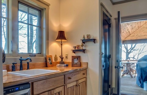 Stroll up the gorgeous staircase to access a guest room with twin beds and full bath on the left and master suite on the right. Wake up to stunning views in the luxurious queen bed. A large, walk-in closet leads to the master bath with a tile walk in shower. The lower level features a fantastic space to lounge and play. Here, there is another bedroom with views and a queen bed, a bunk room with 6 bunks and beautiful bathroom with a tile walk-in shower. The kids (and grown up kids) will love the game room that offers Packman arcade game. The lower level living room also boasts a stone fireplace (not operational) and TV. From here you can access the large lower deck with spa and the same great views… a nice, private spot to sip your morning coffee as you watch the sunrise.