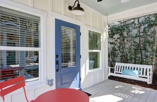 This stylish little cottage has lofty ceilings in bedroom and living room, a lovely front porch w swing and cafe table, and a killer location in quiet and convenient Thunderbolt, Georgia.
