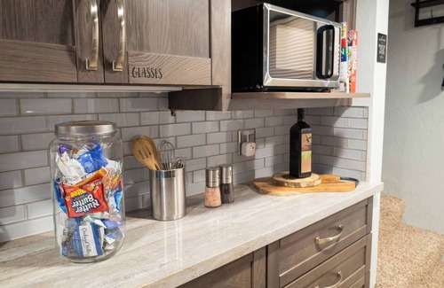 In the spacious 1 bedroom; one king bed and one queen bed with premium memory foam toppers, luxury linens and plenty of extra blankets. USB charging lamps at each bed, each with full size dresser. An adjustable privacy screen separate the areas. The modern bathroom has a large walk-in shower, an assortment of plush towels provided for each guest. The large living area has a queen sofa bed, electric fireplace & 55” Fire TV. The well equipped kitchen also has a fully stocked coffee & tea bar w/drip machine, Nespresso machine & electric kettle. Ground coffee, Nespresso capsules & teas provided along w/sugars, creamers & honey. The private patio has a full kitchen, fire table, extra seating, pond & waterfall.