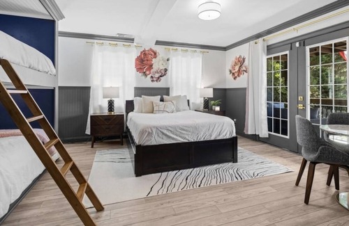 The ROSE ROOM sleeps up to 7, with the luxury of full-size, built in bunk beds AND a queen bed with twin cl trundle bed. This room also has a tv and dinette to seat 4, opening to a private patio.