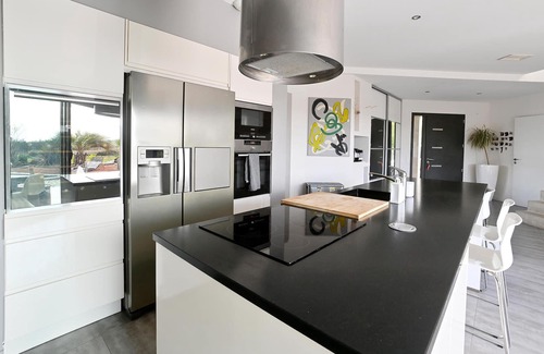 This spacious vacation home is located in an idyllic location in the beautiful town, Teyran, where you can enjoy the tranquility. In the modern and elegantly furnished rooms you will immediately feel at home. Eat an extensive breakfast at the beautiful massive wooden table in an atmospheric ambience. Here you can also plan your vacation program. Need a little nap before lunch? Yes, then throw yourself on the large sofa! In the evening, the top kitchen invites you to sophisticated cooking and cozy chatting after you have showered in the relaxing luxury bathroom. Spend exuberant family time in the outdoor area of the house. Here, sunbathing and pure bathing pleasure are on the agenda. Relax on the sun lounger with a good novel to the song of the cicadas. Cool off now and then in the wonderful pool that beckons with absolute wellness. Relax in the hammock on the covered terrace during the day when you need a break from the all-enveloping heat. After a long day, enjoy a delicious dinner on the terrace and end the evening with a board game. Who will be the winner?