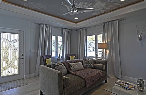 The property features a shared pool, private courtyard and parking for two vehicles, custom finishes, such as original murals, crown molding, pecky cypress ceiling, custom fabric backed banquette seating, floor to ceiling marble bathroom, custom lighting including LED recessed lights, ceiling fans, stainless steel appliances including microwave, quartz counter tops, porcelain faux wood flooring, DVD player, wireless Internet, flat screen TV's, washer/dryer, private courtyard, parking for 2 vehicles.