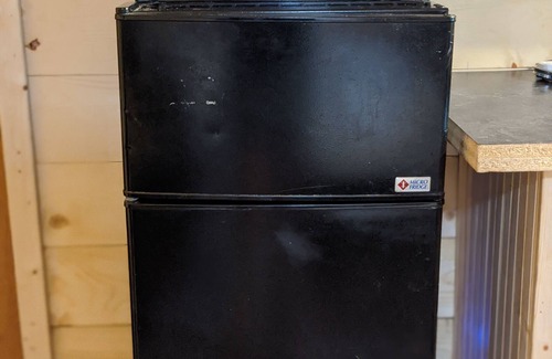 The cabin has air conditioning/heating unit and ceiling fan for your comfort. There is a small kitchen with a 2 burner cook top, a dorm room size refrigerator, microwave and outside propane grill. There is also a fire pit and ample space for a nice campfire to roast hot dogs and make S'mores! This cabin packs MANY items into a small area for your convenience!