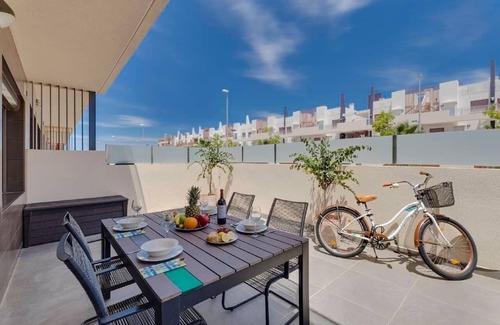 Modern holiday flat with large terrace on the ground floor of a two-storey building. The flat with shared pool is located in the new district of Mil Palmeras, just 43 km from Murcia-San Javier airport and 58 km from Alicante-El Altet airport. It is less than 300 metres from the sea and 500 metres from the beautiful sandy beach of Mil Palmeras. Guests can enjoy the swimming pool in the common area of the complex.