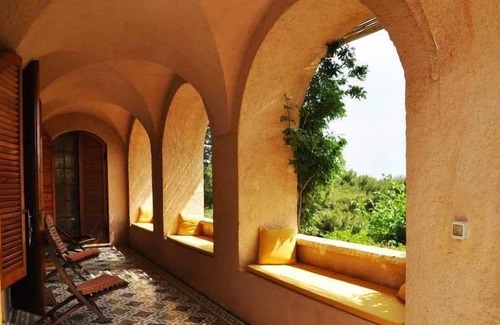 This house is the most beautiful of them all. It has a big bedroom with a double bed, from which you can enjoy a view of the sea. It also has a dressing room with a cupboard and a bathroom with a shower and WC. The big living room of around 40m² provides two sofas, a fireplace and air conditioning. There is a large kitchen with everything you need for cooking and a dining table. The bedroom and the living room look out at an arcade with columns and arches and hand-painted floor tiles, as well as towards the sea. This house is suitable for two people who would like to switch off and relax.