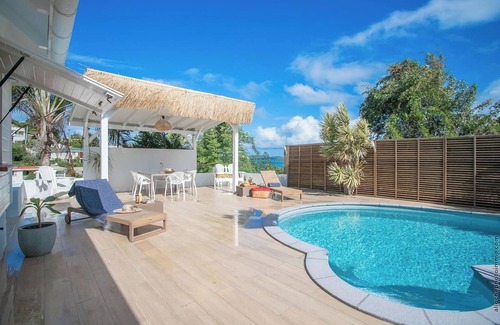 This villa features a lovely 100 m² terrace, perfect for relaxing under the tropical sun. The private swimming pool is open year-round, providing refreshing swims at any time. Indulge in sea views while barbecuing with family in the garden, available for all guests.