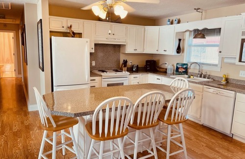 This 3BR/2BA home can sleep up to 8 people. The living room, kitchen and dining areas are spacious. There are windows all around the living room where you can take in the sunsets and huge barges passing by. You gotta see the big barges passing by. They are quite a spectacle.