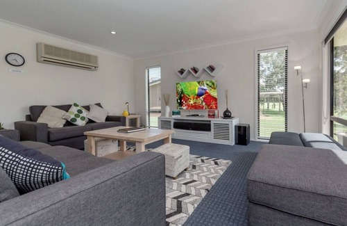 Inside, you'll find air-conditioned living with a flat screen TV, Foxtel with entertainment and sports package, and a DVD player with surround sound, plus a kitchen with microwave, hotplate and an oven, and a gas BBQ on the patio for outdoor dining. There are 2 bedrooms, each with their own ensuite featuring a combined spa bath and shower. One bedroom features a queen bed and king single bed, plus a TV, and the other bedroom has 2 king single beds that can be joined. Guests also have access to an external shared laundry with washer and dryer, and one off-street car space.