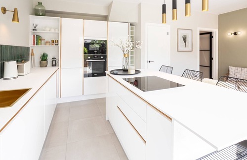 The modern kitchen has a dishwasher, washer/dryer, fridge/freezer, induction hob, electric fan assisted oven, microwave, kettle and toaster. The large island provides a great, sociable dining space but there's also a table and four chairs outside in the enclosed, private garden for warmer days.