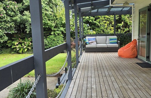 "Treetops" located in Whangamata is set in peaceful gardens, with lawns and established fruit and native trees, the private covered deck is a great outdoor entertaining area, with comfortable seating and BBQ you will feel totally relaxed.