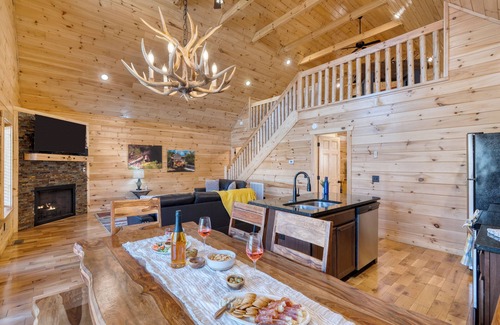 Inside, vaulted ceilings, warm wood paneling, and stylish lodge décor make you feel right at home. The fully equipped kitchen invites home-cooked meals or casual breakfasts at the granite island. The king bedroom features a private ensuite, while a second bedroom with two queen beds and an open loft with two twin beds offer flexible space for everyone to spread out.