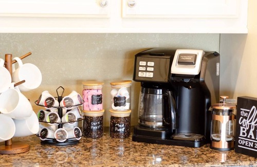 Includes a fully stocked coffee bar with a combo K-cup & drip coffee maker, a french press and pour-over coffee along with an assortment of fresh coffee beans, k-cups and tea