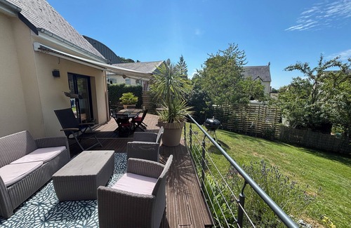 Very bright villa with a beautiful south-west facing terrace. Located 900 meters from the beach and 600 m from shops. Large living room with open kitchen area, bedroom with shower room and separate WC on the ground floor. Upstairs, there are 2 children's bedrooms, a bathroom and a separate toilet. The 700 m2 garden faces a site protected by the coast. Garden tables, barbecue, deckchairs are at your disposal to enjoy. Have a good stay