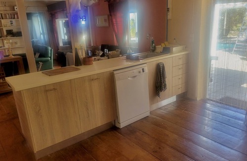 House of character with panoramic sight on the sea which is to 3 km (as the crow flies) belonging to a private field including/understanding 3 completely insulated houses and independent one of the other,each one with its private swimming pool (blue, yellow one and presented the it here: the pink). Very calm place without neighbor, any comfort, decoration looked after, large terrace of 200 m2 with private swimming pool of 9 X 5 meters and a beautiful private garden. 3 bedrooms : two bedrooms double beds + extra bed, shower, sink and toilet in each room - a room with a single bed and bunk beds, sink and toilet (decorated for children but beds 0,90mx 2,00m ) -Stay and equipped kitchen (dishwasher, ceramic hob cooker, Senseo coffee machine, microwave ...) fridges with freezer, wood fire -Washing machine. -TV (Flat screens and DVDs in all bedrooms each with its decoder with access to all French channels, stereo and giant flat screen TV in the living room) - -Packaging air and heating in winter.Chassis double glazing and shutters.We ask a package of 50 € for the supply of bed sheets, baths and the complete cleaning of the house when you leave. Short stays allowed out of season.