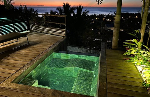 The jacuzzi faces the sunset and the beach is a 7-minute walk away.