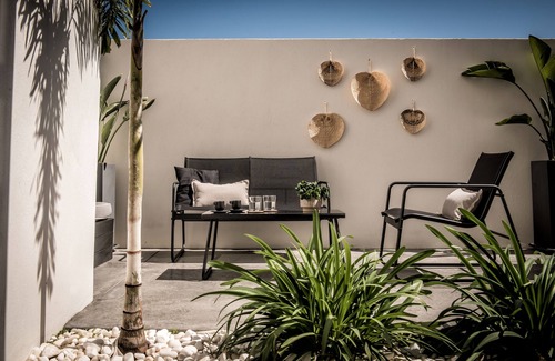 Icos City 1. Experience a luxurious holiday in our exclusive apartment in bustling Chersonisos, on the island of Crete. Located in the beating heart of the city, you enjoy ultimate central accessibility. Icos City is within walking distance of beaches, shops and restaurants. Enter our beautiful private patio with a jacuzzi, sunbeds, an attractive dining area and a lounge area to relax. The master bedroom has a walk-in closet, while the second bedroom opens up to the serene patio. Relax in the cozy living room and enjoy the comfort of a fully conventional kitchen. Surrounded by palm trees, this apartment offers a perfect blend of urban allure and relaxed luxury.