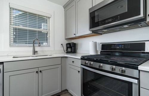 The downstairs also has a living area with a 42" flat screen smart TV and small kitchen area for coffee and drinks. Two additional bedrooms can be found downstairs, one King bedroom and a Twin bedroom with a twin bed and twin trundle bed. There is handicap bathroom with a shower/seat, and a walk-in tub with plenty of room for walkers.