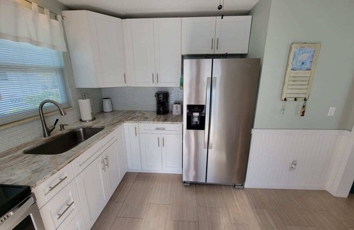 Located on a gorgeous fresh water lake, Indian Bayou Lake House 1 offers 2 bedroom and 1 bath accommodations. Walk into the open concept living area and take in the views of the lake from the floor to ceiling glass. Enjoy a full kitchen with all your major appliances and everything you need to whip up something tasty. Slip through the slider to step out on the deck overlooking the lake. You'll find seating and a BBQ grill out there. You're sure to spot some wildlife, from birds and ducks to turtles and fish. It's the perfect spot to sip your morning coffee or drink your evening wine. Both bedrooms feature queen size beds. In the bathroom you'll find a tub/shower combo. The closet in the hall near the bathroom has your stack washer and dryer in it. Downstairs you'll find the awesome shared tiki bar area, complete with a drink fridge and plenty of seating. There is also a full (shared) bathroom down there so you don't have to walk back upstairs while you're enjoying the bar area. The hammock off to the side is another great place to enjoy the outdoors, maybe relax and read a book. You won't be dissapointed when you book your stay at Indian Bayou Lake House 1!