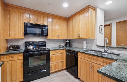 This third floor, ski-in, ski-out, two-bedroom residence offers a family room with a sleeper sofa, a complete kitchen with granite countertops, and dining niche. Additional features include two guest suites, each an attached bathroom and king size bed, a private deck, washer/dryer and garage parking. This residence can be converted into a one-bedroom and studio.