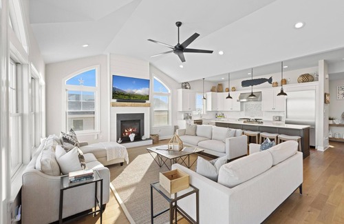 At the heart of the home is the oversized living room . A true showpiece that exudes a coastal warmth and sophistication. The cozy gas fireplace & vaulted ceilings add to the airy, open feel,